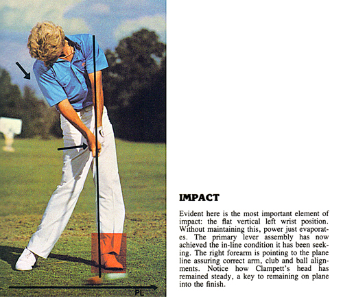Impact. Evident here is the most important element of impact, a flat and vertical left wrist, without which power just evaporates. The primary lever assembly (left arm and clubshaft) has achieved the in-line condition it has been energetically seeking. The magical right forearm is again on plane assuring correct arm, club and ball relationships. The right wrist shows slightly more bend than at address. Therefore there is a deviation in left wrist flatness, though not visibly perceptible, that does not escape the ball computer which receives, analyzes and responds to all impact geometry. The ball does not dive into the lake because it is mad at you, but because it is law-abiding.