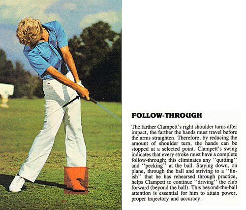 Follow-Through. The farther the shoulder turns after impact, the farther the hands must travel before both arms become straight for their follow-through alignments. Therefore, by reducing shoulder turn the hands can be automatically stopped at any selected point -- no more double impact putts -- by prepositioning the shoulders with the club at the desired limit point. Remember that every stroke must have a complete follow-through to prevent quitting and pecking at the ball. The follow-through can usually substitute for most of the less than full power stroke finishes and still protect against "chopping" at the ball. That is the first step away from hacking.