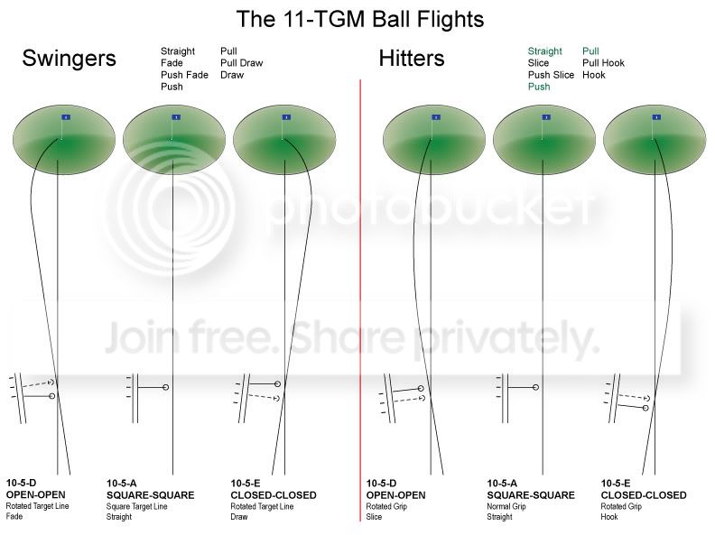 Forgetting True Swingers for a bit and dealing with Hitters and manipulated hands Swingers alignments, can you incorporate the quote above into a drawing similar to your 10-5-A , removing the flag maybe and showing how the ball would react for each procedure. Im thinking this will show the various flight characteristics in a more comparable manner. One ball going straight to the middle of the green, one falling to the right side and short etc. Would a pull, draw go longer and left?