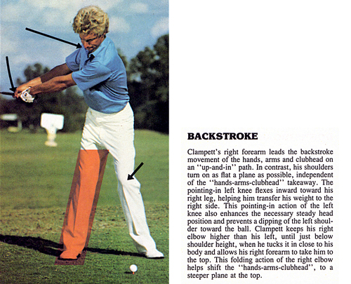 Backstroke. After the address routine and a preliminary turn of the right hip, the right forearm takes the hands and clubhead back-up-and-in simultaneously and instantaneously and the shoulder turn is as flat as possible and independent of the takeaway action. The left knee flexes only enough to keep the head still and hold it in a strong solid position. Bobby's right elbow appears unusually high here which may be intentional and for a purpose. It appears to be a shoulder turn takeaway action. That always produces an automatic and unintentional shift from a flat first plane to a steeper plane at the top. That could lock a player into a pivot controlled hands procedure unless carefully realigned during the interval at the top. Then it can again be the Golfing Machine hands controlled pivot procedure.