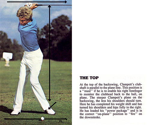 The Top.The clubshaft parallel to the ground must also be parallel to the base line of the plane (plane line). When not parallel it must be pointing at it. All elements of the stroke must be adjusted and aligned during this particular interval in order to move precisely toward the plane line guided by the #3 pressure point (right forefinger clubhead feel). The shoulder turn function here is to place the right shoulder precisely on the inclined plane. Therefore it is mandatory that the steeper the plane the shorter the shoulder turn and foot and knee action must be no more than needed to accomplish those relationships.