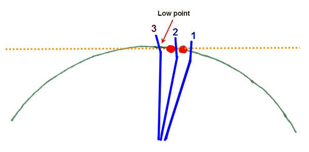 Point 3 is the low point of the clubhead arc, and it is 4" ahead of point 1 (as measured linearly along the ground). It is at this point on the clubhead arc, that the hosel of the clubshaft is going to start moving forwards, upwards and inwards. At this time point, the clubshaft must be vertical to the ground, and if it is vertical to the ground, and the club has a hook-faced offset clubface, then surely the clubface must be slightly closed to the clubhead arc at this time-point. That also means that the back of the left hand must be facing slightly left of the target at the low point of the clubhead arc (if it was facing the target at impact).