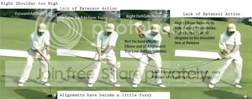The Power Package Motion during the Downstroke is identical for Hitters and Swingers. Notice the above Golfers Elbow Bend at the Top Of the Swing. It's about 90 degrees. For a Swinger, this is too much Bend. So at Release, the Right Forearm would be above Plane, as in the photo. Unbend it 5 degrees at the Top, and if this was a swinger, the Right Forearm would be On-Plane with the Elbow location in the photo. But the Guy above wants to Hit. So his Elbow Bend is good at 90 Degrees but his Elbow should be Pointing behind him more at the Top of the Swing. That would Angle his Forearm more at the Top, but also at Release, because his Elbow would be at the back of his side and his Forearm would be On-Plane. In the Photo above, his Right Elbow is too much in front of his right hip by a couple of inches. He also loses a slight amount of waist bend at Release. But if you add 2" for Elbow Location and 2" for Waist bend, his Forearm would be a little below plane but then he could add a little more elbow bend at the Top, say another 10 degrees and put him at 80 degrees which would give him more elbow bend at Impact and/or a longer Piston/Fanning Action for Release. It's simply a matter of Elbow Location at the Top of the Swing.....