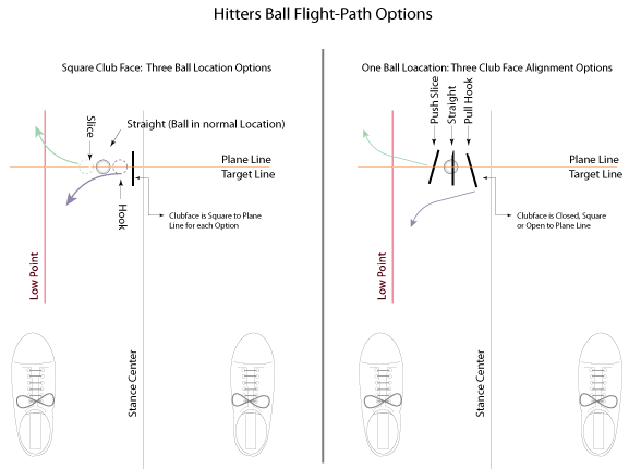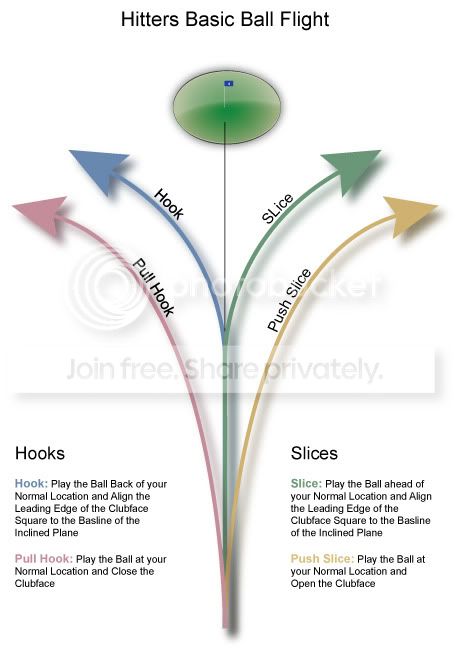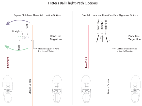 Besides the Pull and Push which have not been thus far illustrated; the Slice, Push Slice, Pull Hook and Hook are the ONLY Ball Flights available to a Hitter in which the "Line of Compression" be sustained for a controlled and repeatable procedure. Any other manipulation may and will produce a wide variety of Flight Paths and Trajectories which make distance control a "guesswork" procedure. So, Clubface and ball location changes don't result in more leakage of compression, but as soon as you add a Target Line adjustment, then adjusting Ball Flight is a matter of adding or reducing leakage. It's not the way to lower scores.